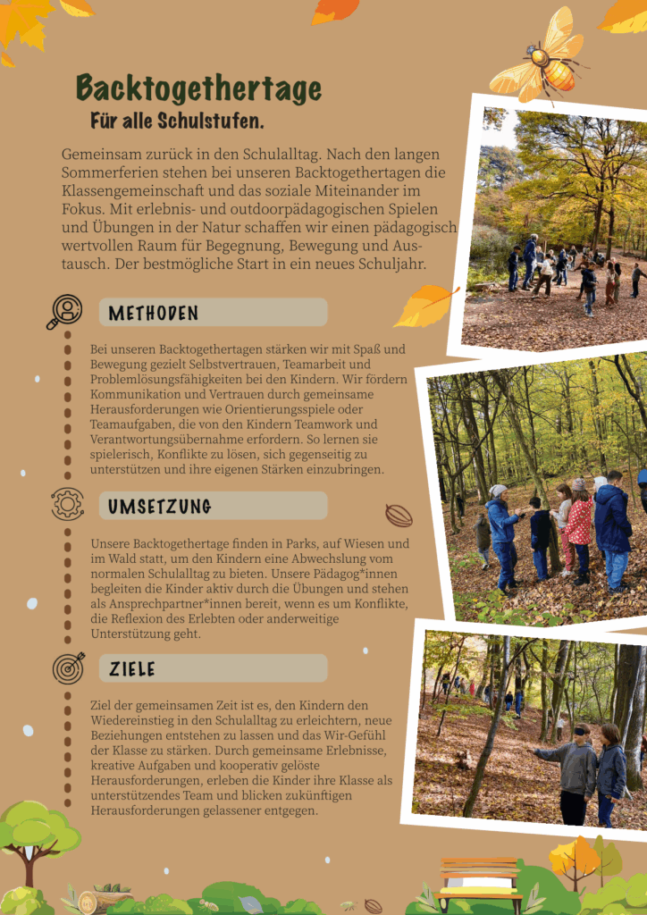Gemeinsam zurück in den Schulalltag. Nach den langen Sommerferien stehen bei unseren Backtogethertagen die Klassengemeinschaft und das soziale Miteinander im Fokus. Mit erlebnis- und outdoorpädagogischen Spielen und Übungen in der Natur schaffen wir einen pädagogisch wertvollen Raum für Begegnung, Bewegung und Austausch. Der bestmögliche Start in ein neues Schuljahr.